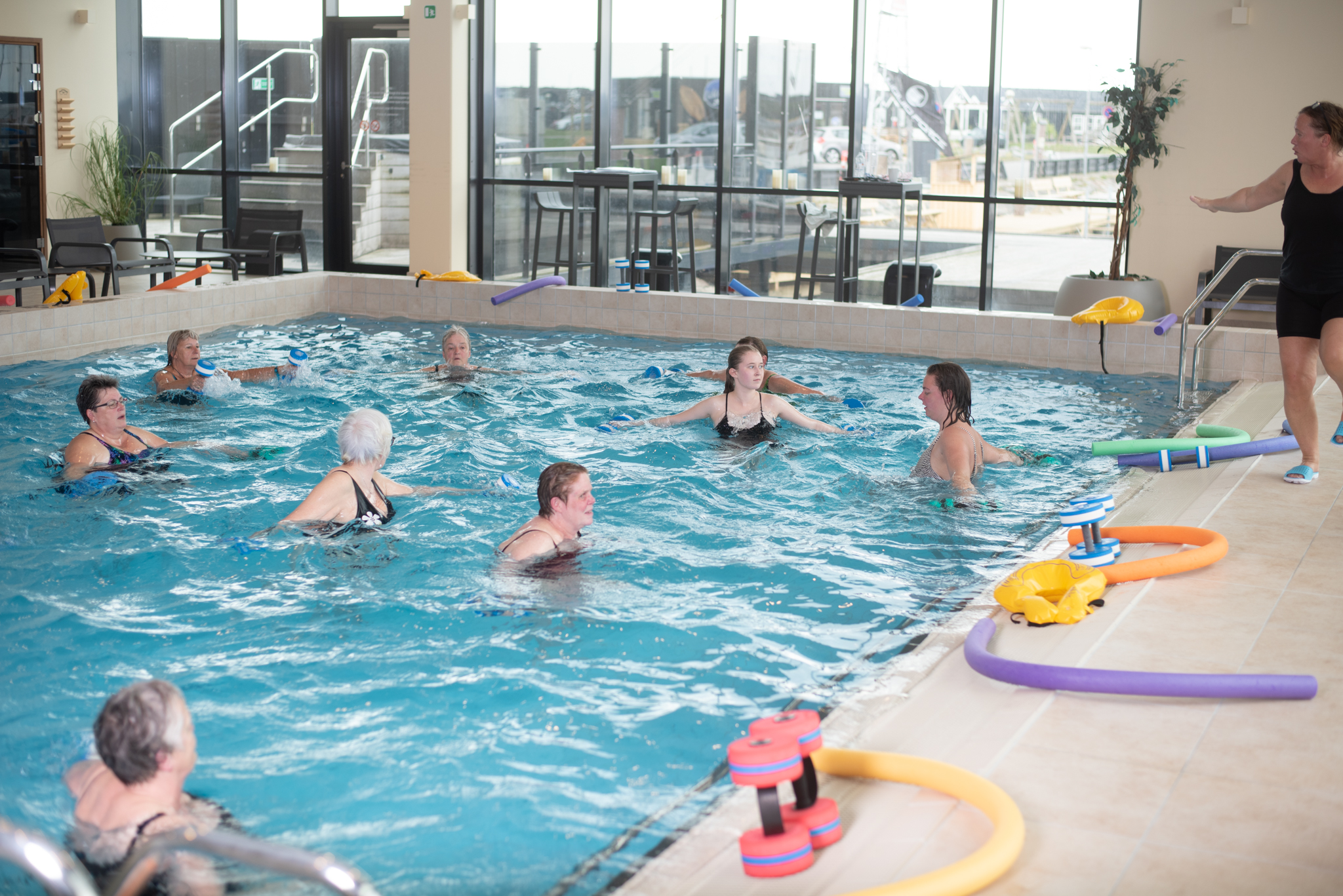 Det varme, bærende vand giver mulighed for at bevæge kroppen mere frit, end mange oplever på land. Øvelserne tilpasses holdets niveau og kombinerer styrke, stabilitet, kredsløb og afspænding. Der anvendes forskellige redskaber som støtte og variation i træningen.